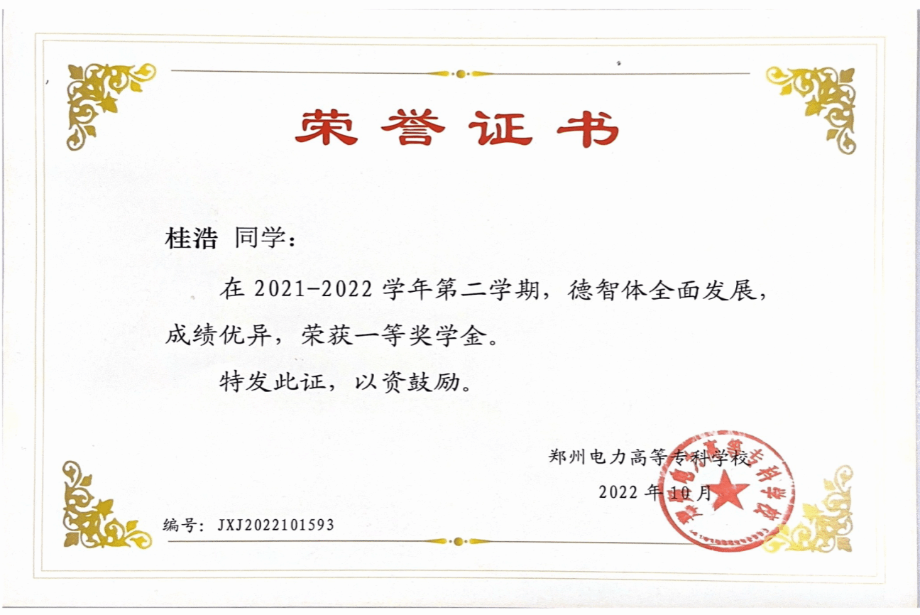 桂浩以“书山有路勤为径,学海无涯苦作舟”为信念,在专业学习上,做到眼到、手到、心到。以严谨的学习态度及独立的自学能力,刻苦努力,学以致用。他认真学好每一门课程,打下了扎实的专业理论知识基础。三年年度综合成绩排名1/92,并荣获“国家奖学金”1次、“国家励志奖学金”1次、“校级一等奖学金”5次,获得学校“优秀学生干部”、“优秀毕业生”、“三好学生”、“优秀共青团干部”等荣誉称号。