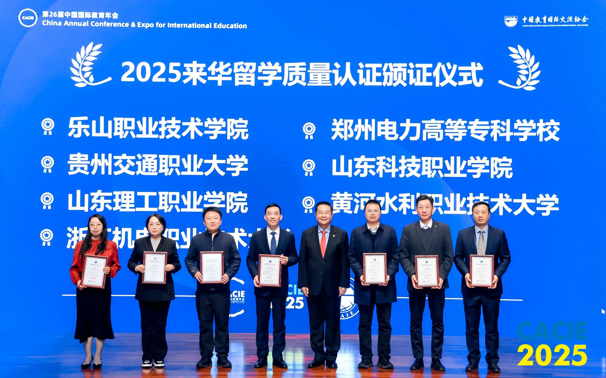 会议期间,教育部来华留学质量认证授牌仪式同期举行。中国教育国际交流协会会长刘利民为我校郑重颁发来华留学质量认证证书并授牌。作为河南省首批通过认证的高职院校,这一权威认证既是对学校来华留学生培养体系、教学质量与管理服务的高度认可,也标志着我校在国际化人才培养领域实现“走出去”与“引进来”双向赋能的里程碑式突破。此次参会既展现了我校电力职教国际化的成果与影响力,更搭建了深化国际合作的新桥梁,进一步拓宽了国际合作维度,为深化国际教育交流与人才培养筑牢了坚实根基。