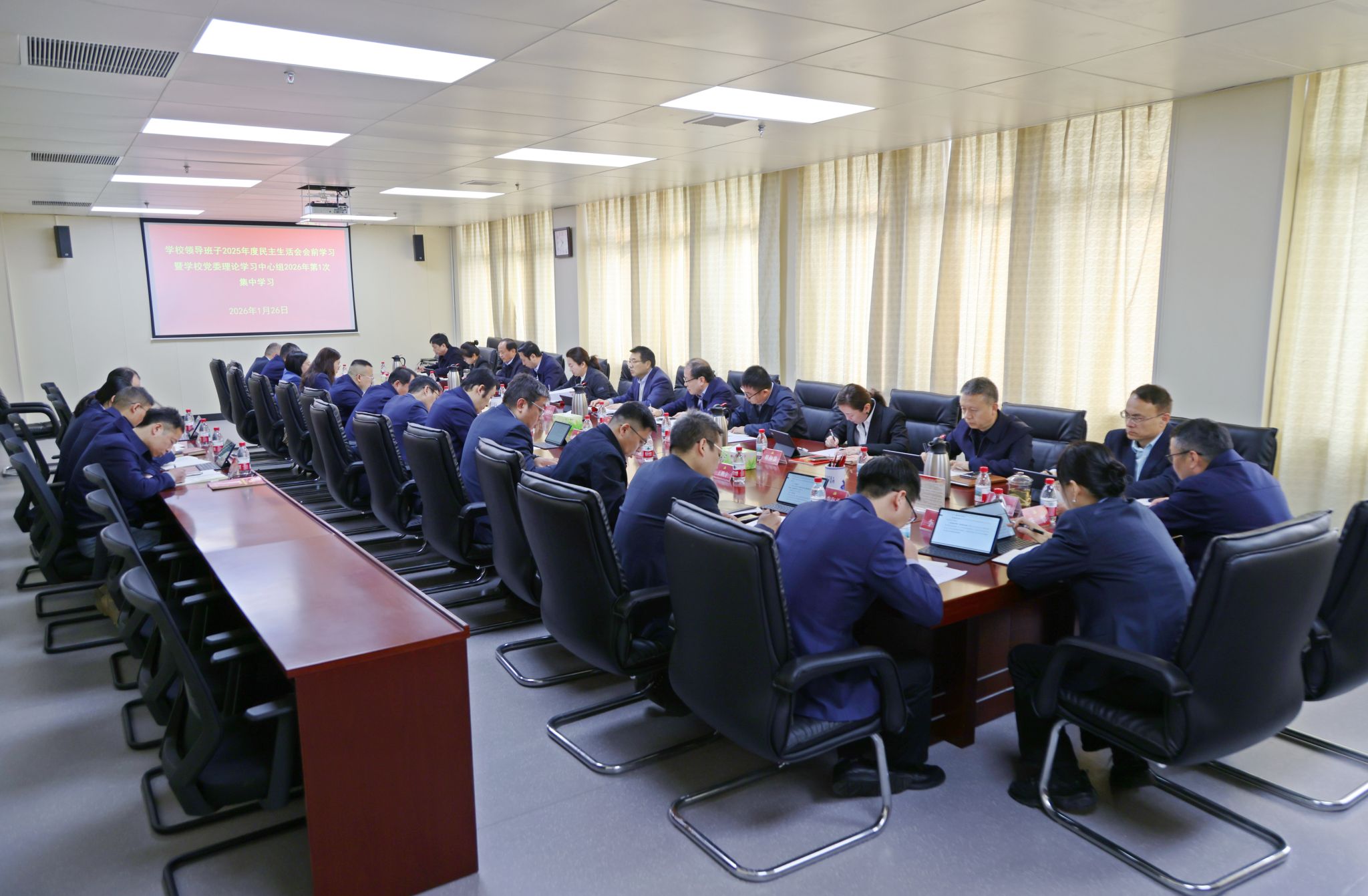 2026年1月26日,学校举行领导班子2025年度民主生活会会前学习暨学校党委理论学习中心组2026年第一次集中学习,为开好民主生活会打牢思想基础。学校党委书记田世立主持并作中心发言,学校领导班子成员依次作重点发言。