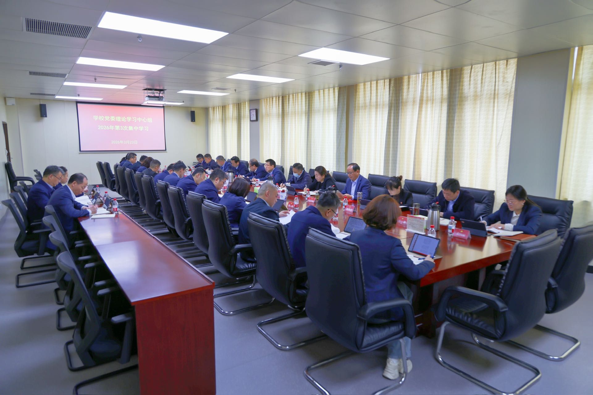 2026年3月23日,学校党委理论学习中心组举行2026年第3次集中学习,深入学习领会习近平总书记关于树立和践行正确政绩观的重要论述。学校党委书记田世立主持会议并作中心发言。党委副书记、副校长胡斌,电力工程学院党总支书记李扬作重点发言,马克思主义学院党支部书记姚琦,人力资源部(企业管理部、教师发展中心)主任赵峰提交书面交流材料。