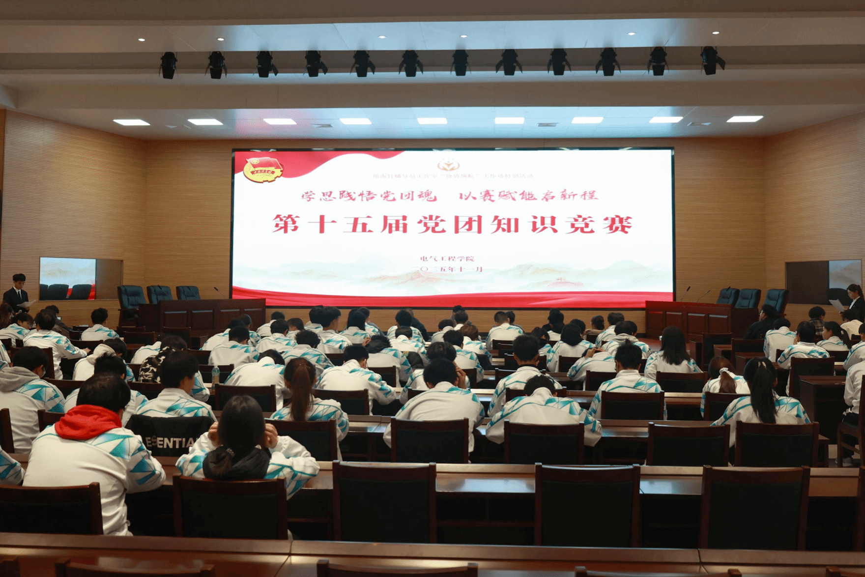 为全面提升广大青年学生的政治理论素养,培育爱党爱国情怀,“指南针”辅导员工作室“价值领航”工坊特别活动暨电气工程学院第十五届党团知识竞赛于11月25日下午在聆心讲堂成功举办。