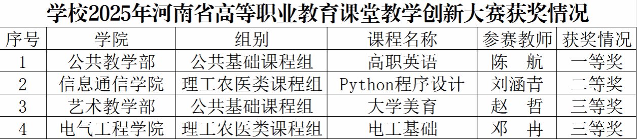 近日,河南省教育厅公布了2025年河南省高等职业教育课堂教学创新大赛结果。学校参赛教师凭借扎实的教学功底、创新的教学设计及高效的实践转化能力,获一等奖1项、二等奖1项、三等奖2项,充分彰显了学校教师队的过硬的专业素养与强劲的教学创新活力。