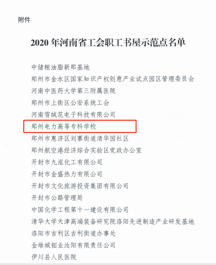 近日,学校被河南省总工会命名为“河南省工会职工书屋示范点”,昭示学校职工文化、校园品牌得到进一步彰显,学校精神文明建设得到进一步提升。近年来,学校积极构建职工文化“三和谐”,激发了全校教师员工工作和生活的激情和热情,形成了共建和谐、共享幸福的可喜局面,有力促进了学校高质量发展。
