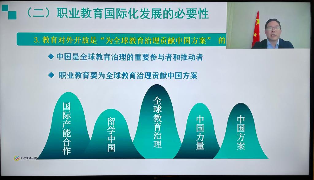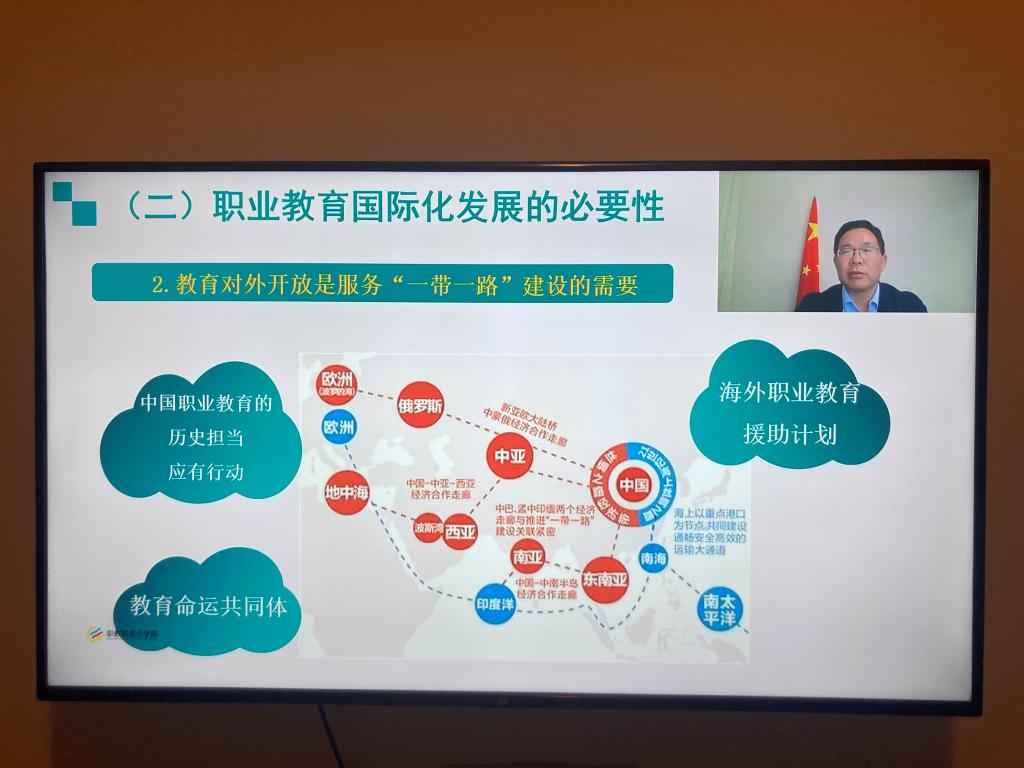 2021年4月29日,杨建华校长接受邀请做客职教联盟云学院《职教百家讲坛》,做题为《郑州电力高等专科学校国际化发展模式探索与实践》主题讲座。讲座从学校适应经济全球化趋势、发挥电力行业平台及“一带一路”电力丝路学院联盟优势、“组团”培养国际化技术技能人才、支持国家“一带一路”倡议和中国的产能输出等几方面,分享郑州电力高等专科学校历经近20年“引进、创新、输出”三个阶段的国际化办学探索和实践经验,共同探讨职业教育国际化发展的模式和路径。