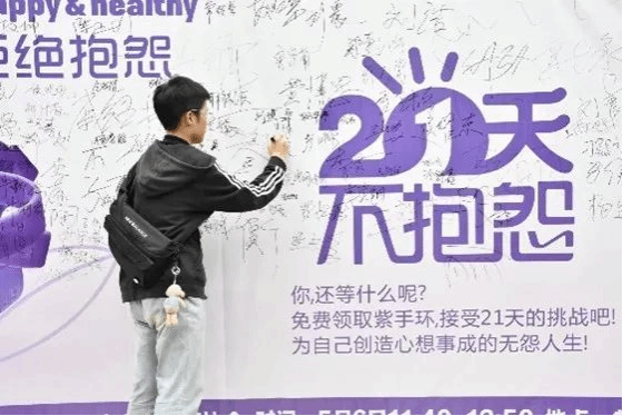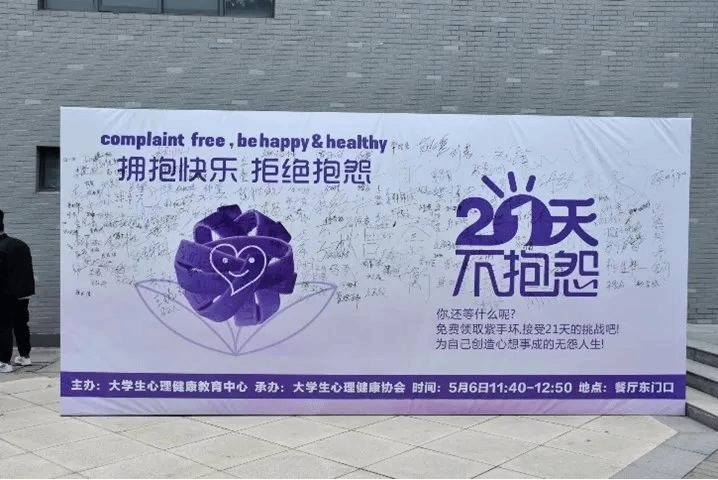 与心对话,认识自我;遇事不怨,受挫不责。抱怨是最消耗能量且无益的举动。5月6日,大学生心理健康教育中心发起了一场“21天不抱怨”活动,提倡同学们用积极心态面对生活,让我们一同来见证紫手环给予我们的力量吧!