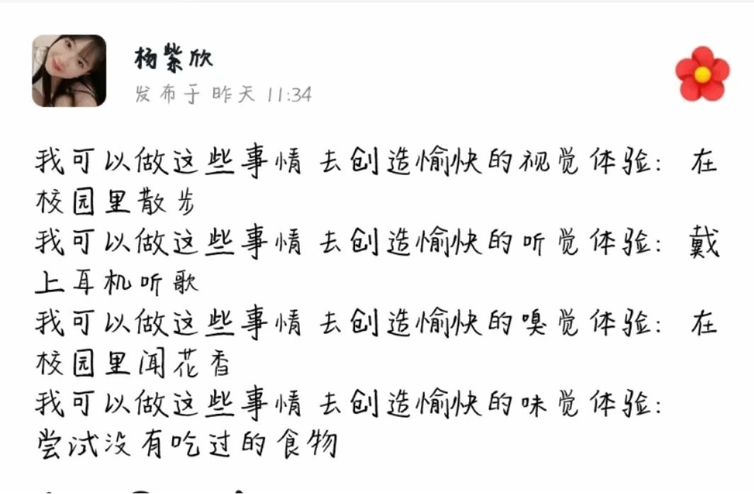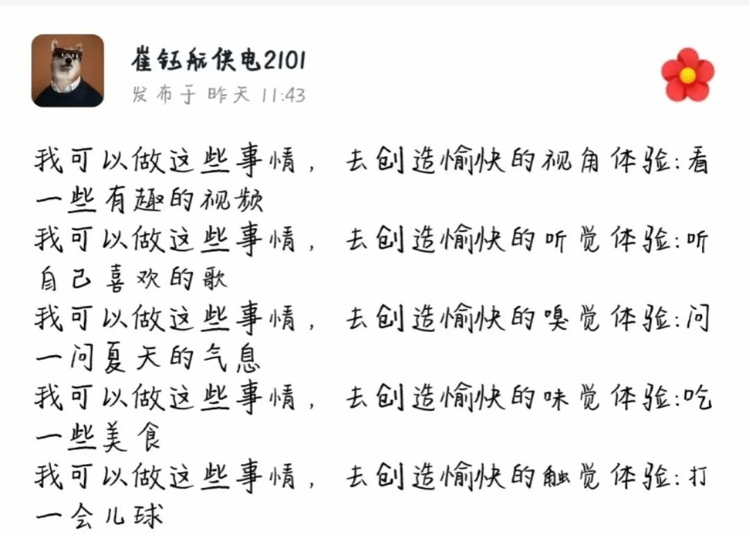 当我们害怕、焦虑时,容易花大量的时间精力去思考可能发生的事情,如果我们把更多的精力放在现实世界,主动制作愉悦的感官体验,那么就能有效减少负面情绪的发酵,如果我们能在有限的范围内做一些力所能及的事情,那么就能激发行动起来的动力,帮助我们应对更多的挑战!目前第三阶段还在进行之中,看看小伙伴们的打卡吧!