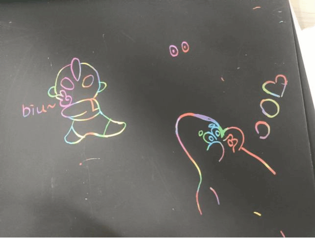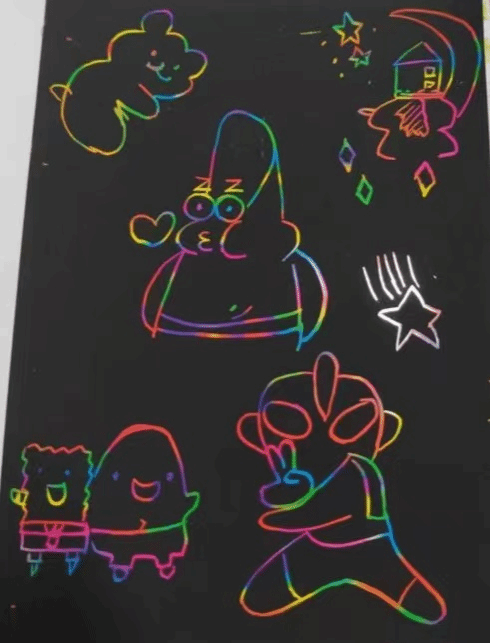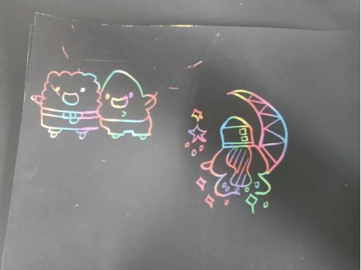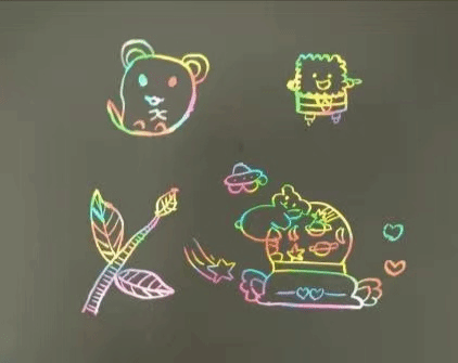 刮画是一种新型的绘画方式,在一张黑色卡纸上能刮出色彩斑斓的图画,对比强烈,有良好的视觉效果。同学们大胆创作,体验刮画带来的新奇感,享受制作过程中的乐趣,并相互分享成功的喜悦。