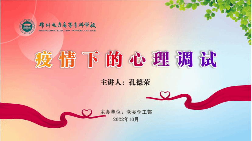 为贯彻落实河南省教育厅《关于开展2022年度全省高校心理健康教育宣传周活动的通知》要求,进一步做好疫情封控期间我校师生心理支持工作,引导广大师生关注心理健康,提高自身心理问题识别和危机的处理能力。10月29日,学校特邀郑州市第八人民医院副院长孔德荣教授为我校师生开展了《疫情下的心理调适》线上专题讲座,校内200余名师生在西阶梯教室集中观看了讲座,累计有2508名师生通过微信直播的方式同时收看了讲座。