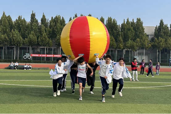 巨型“风火轮”在操场上滚动,同学们齐心协力,智慧与意志并重,向着终点冲刺,展现出了不凡的意志力与团队精神!